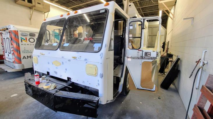 With over 125 labor hours estimated from start to finish, we kicked things off by removing it’s many components: mudflaps, decals, lights, sign panels, loud speakers, and safety tape all had to come off.